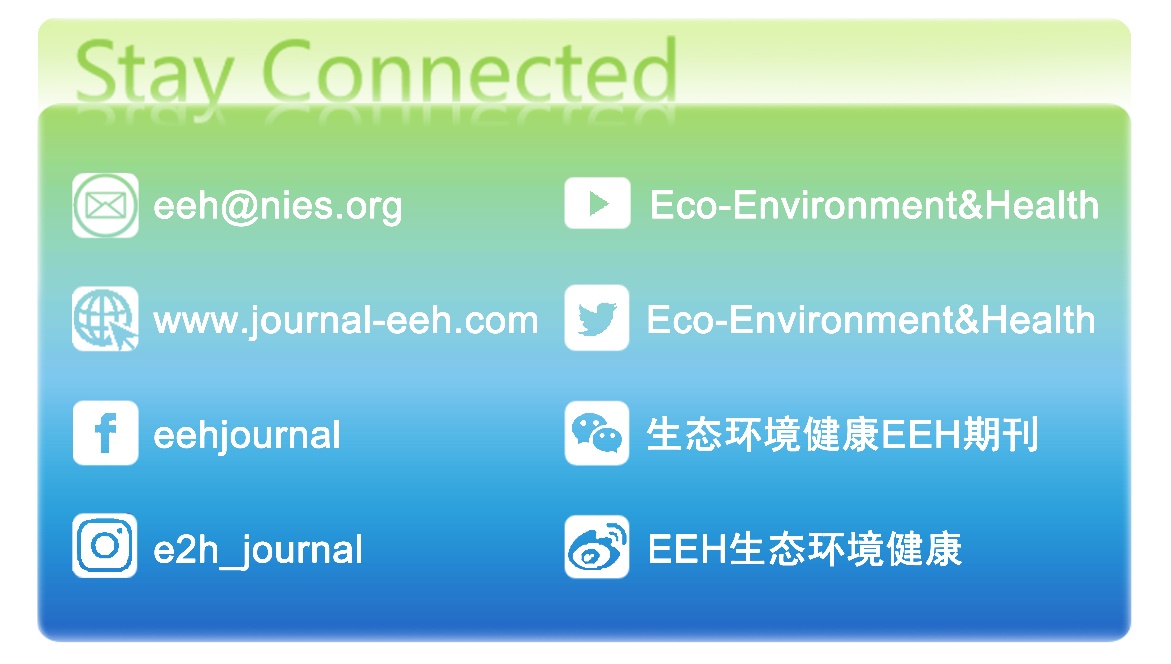 Eco-Environment & Health(EEH)期刊是由南京大学和生态环境部南京环境科学研究所共同创立的英文期刊,以期打造成为环境健康领域旗舰期刊。 EEH聚焦大健康(One Health)理念,助力绿色可持续发展,关注生态、环境与健康之间交互作用的过程、机制与干预,范畴包括生态安全、环境健康风险、生态与环境修复。重点方向为:生态与生物多样性保护,新污染物的环境归趋与生物过程,人体暴露与健康效应,环境风险评价、管理与调控。
