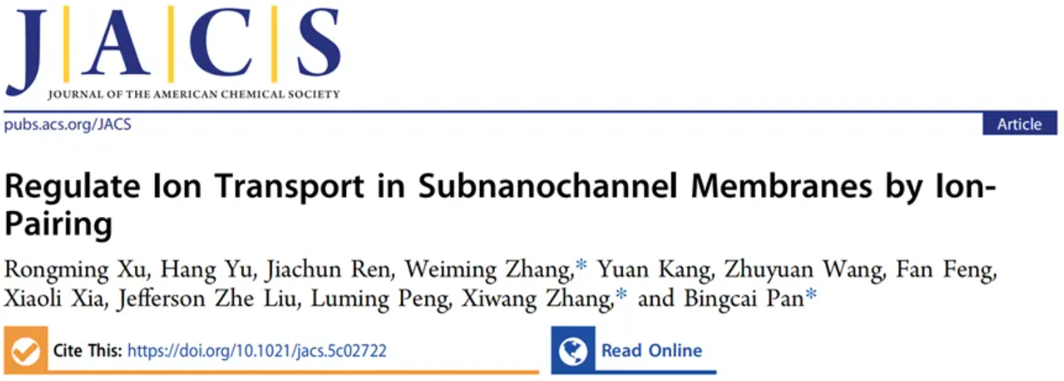 该研究工作以"Regulate Ion Transport in Sub-nanochannel Membrane by Ion-pairing"为题,发表在知名学术期刊Journal of the American Chemical Society上(原文链接://pubs.acs.org/doi/10.1021/jacs.5c02722)。团队博士后许荣明为论文的第一作者,张炜铭教授、张西旺教授(昆士兰大学)、潘丙才教授为通讯作者,团队博士生余航、硕士生任佳纯、莫纳什大学博士后康源、昆士兰大学博士后王祝愿、墨尔本大学刘哲教授、博士生冯帆、南京大学化学化工学院彭路明教授、博士生夏晓丽为共同作者。研究得到了国家自然科学基金(U22A20403, 21925602)、澳大利亚研究理事会ARC未来学者研究基金(FT210100593)、上海同济高廷耀青年博士生杰出人才奖学金以及中国科学院生态中心奥加诺(水质与水环境)奖学金资助。